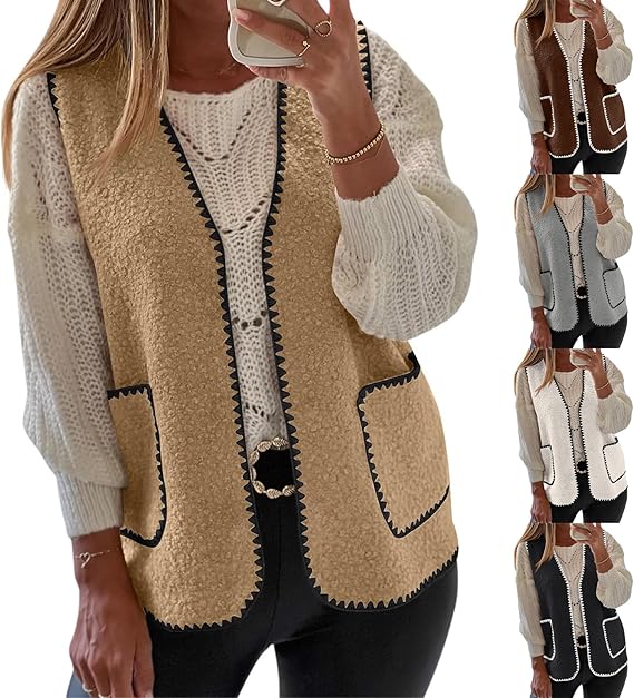 Womens Fleece Sherpa Vest Sleeveless Open Front Cardigan Color Block Fuzzy Jacket with Pockets